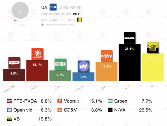 Según el sondeo, N-VA se consolida como la fuerza principal con un 26,5% de intención de voto, seguida por Vlaams Belang (VB) con un 19,8%. Vooruit alcanza el 15,1%, mientras que CD&V obtiene un 13,8%. PTB-PVDA se sitúa en un 8,8%, Groen en un 7,7%, y Open Vld cae a un 6,3%.