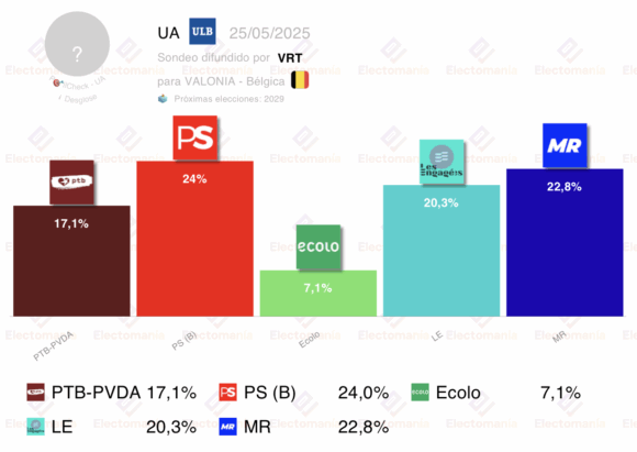 El sondeo indica que PS se mantiene como la fuerza principal con un 24,0% de intención de voto, seguido de cerca por MR con un 22,8% y Les Engagés con un 20,3%. PTB-PVDA obtiene un 17,1%, mientras que Ecolo cae a un 7,1%.