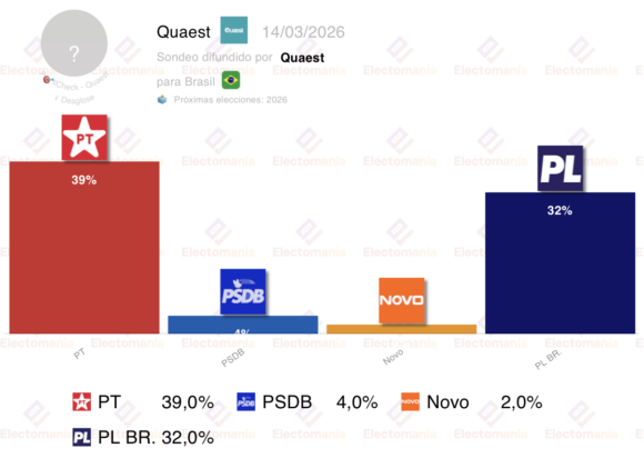 Sondeo para elecciones presidenciales en Brasil, de Quaest, indica un empate perfecto en la segunda vuelta de las elecciones presidenciales en Brasil.