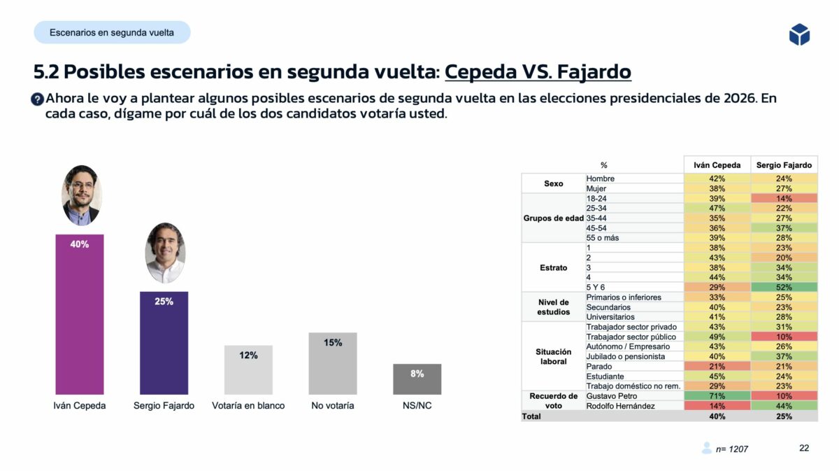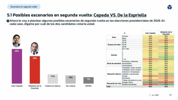 En un eventual balotaje Cepeda vs. De la Espriella, el senador del Pacto Histórico alcanza el 40 % frente al 32 % de su rival, con un 11 % de voto en blanco, un 10 % que no acudiría a votar y un 7 % de NS/NC.