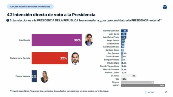 En voto espontáneo para la Presidencia, Iván Cepeda obtiene alrededor del 30 % de apoyos, situándose como el nombre más mencionado entre los consultados.