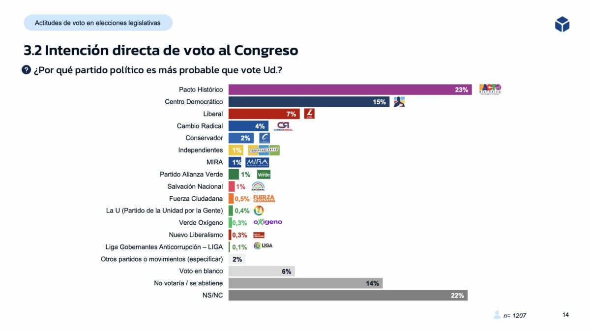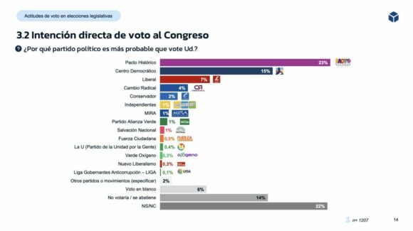 El estudio también mide voto directo para elecciones legislativas y sitúa al Pacto Histórico como primera fuerza, con aproximadamente un 23 % de intención de voto al Congreso.
