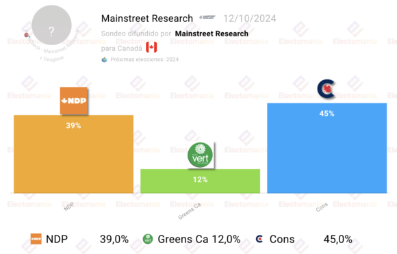 Sin embargo, una segunda encuesta difundida por Mainstreet Research, basada en entrevistas telefónicas, presenta una narrativa distinta. En este caso, el Partido Conservador aparece como el claro ganador, con un 45% de apoyo, mientras que el NDP cae significativamente hasta el 39%. Los Verdes, en este sondeo, aumentan su respaldo al 12%, lo que muestra un leve repunte para la tercera fuerza política en la región.