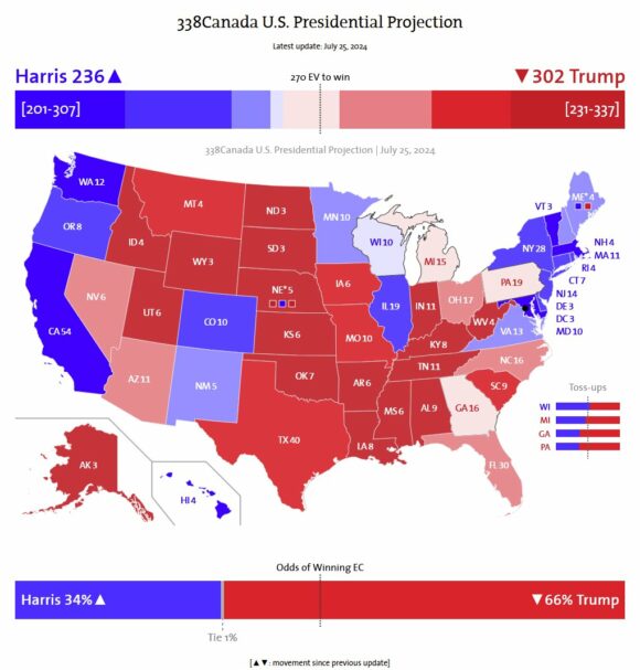 Según el sondeo, el republicano lideraría con un 48 % de apoyo frente a la demócrata, que obtendría un 47 %, aunque la diferencia es tan estrecha que entraría dentro del margen de error estadístico, que es de 3,4 puntos porcentuales.