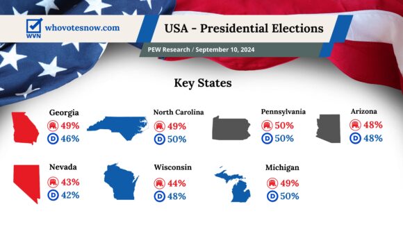 En los siete estados clave que decidirán las elecciones, los resultados varían ligeramente respecto al panorama nacional y favorecen a Harris. La candidata demócrata supera a Trump en Wisconsin (50% frente a 47%), Michigan (49% frente a 47%) y Pensilvania (49% frente a 48%), mientras que ambos están empatados con el 48% en Nevada, Georgia, Carolina del Norte y Arizona.