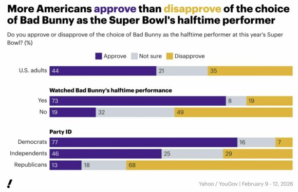 El 47% de los adultos afirma haber visto la actuación de Bad Bunny, pero la audiencia fue claramente progresista: 61% entre demócratas y afines, 23% entre republicanos.
