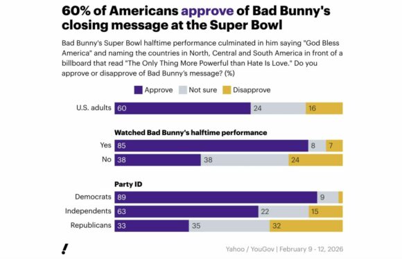 En la nueva encuesta nacional de Yahoo/YouGov, el 42% dice que Bad Bunny “representa mejor a América”, frente al 39% que elige a Trump.