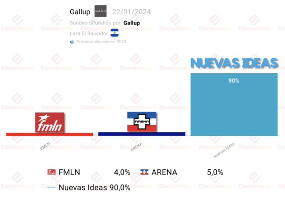 Sondeo de Gallup para elecciones en El Salvador muestra a Nuevas Ideas de Bukele logrando una aplastante mayoría con cerca del 90% de apoyos.