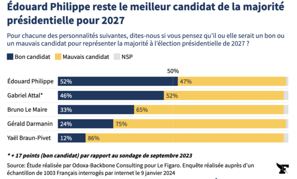 No obstante, a pesar de las opiniones favorables, Attal no se perfila como el candidato natural para la mayoría en las elecciones presidenciales de 2027. Aunque ha visto un aumento significativo en la aprobación, ganando 17 puntos y alcanzando un 46%, todavía está por detrás de Édouard Philippe, quien lidera con un 52%, habiendo aumentado 2 puntos. Los ministros salientes de Economía, Bruno Le Maire (33%, +5 puntos) y del Interior, Gérald Darmanin (24%, -4 puntos), están más rezagados, mientras que la presidenta de la Asamblea Nacional, Yaël Braun-Pivet, ocupa el último lugar con un 12%.
