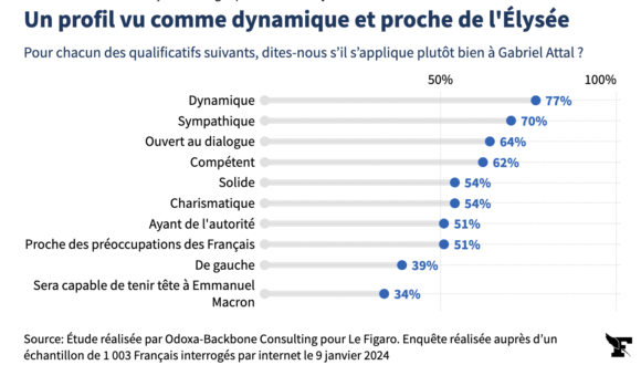El nuevo Primer Ministro de Francia, Gabriel Attal, ha recibido una valoración positiva en términos de su perfil y características personales, según el último sondeo de Odoxa para Le Figaro. La encuesta destaca que Attal es apreciado por su dinamismo (77%), simpatía (70%), apertura al diálogo (64%), competencia (62%), solidez (54%) y autoridad (51%). Sin embargo, su juventud (34 años) solo se considera una ventaja para el 35% de los encuestados, mientras que el 49% no ve su edad como ni un atout (ventaja) ni un handicap (desventaja), a pesar de ser el Primer Ministro más joven en la historia de la Quinta República Francesa.