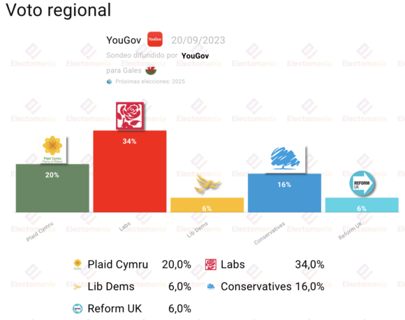 Encuesta Gales (YouGov Sep): sorpasso del Plaid Cymru a los conservadores