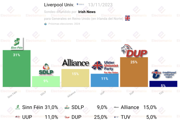 Hoy se ha conocido un sondeo de la Universidad de Liverpool para elecciones a Westminster en Irlanda del Norte que apunta a un fuerte cambio de tendencia, con el Sinn Féin adelantando a la DUP y superando el 30% de apoyos, como primera opción en unas generales en UK.