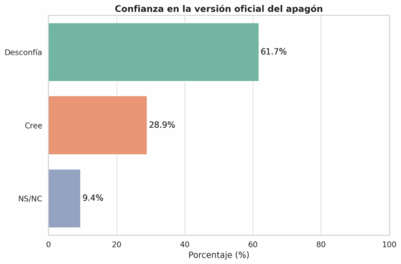 En cuanto a la interpretación general sobre el origen del apagón, el 61,7% de los encuestados desconfía de la versión oficial, frente al 28,9% que sí la cree y un 9,4% que no tiene una opinión formada. El escepticismo es más elevado en el grupo de edad de 35 a 54 años (64,6%), y nuevamente se reflejan diferencias según el voto: los votantes de izquierdas tienden a alinearse con el Gobierno, mientras que los de derechas mantienen una actitud crítica.
