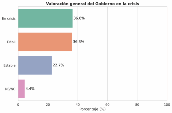 Respecto a la percepción general del Gobierno en esta crisis, se observa una división clara: el 36,6% lo considera “en crisis” y el 36,3% lo califica como “débil”. Solo un 22,7% percibe estabilidad, y un 4,4% no ofrece respuesta. Las generaciones más jóvenes tienden a ver al Gobierno como estable, mientras que las mayores se inclinan por la percepción de crisis. Incluso entre los votantes del PSOE, un 15% reconoce una situación de debilidad y un 6,7% habla directamente de crisis; en el caso de los votantes de Sumar, estos porcentajes ascienden al 22,5%.