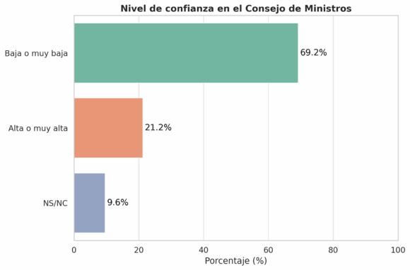Cuando se amplía la percepción al conjunto del Consejo de Ministros, el grado de desconfianza crece aún más: el 69,2% califica la confianza en el gabinete como “baja o muy baja”, frente al 21,2% que la considera “alta o muy alta” y un 9,6% que no se pronuncia. El patrón generacional se mantiene, y entre los votantes socialistas, un 16,2% muestra también desconfianza hacia el Consejo.