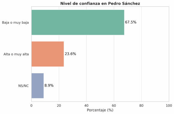 En lo que respecta a la figura del presidente del Gobierno, el 67,5% declara tener un nivel “bajo o muy bajo” de confianza en Pedro Sánchez, mientras que el 23,6% mantiene una confianza “alta o muy alta”. Un 8,9% no manifiesta opinión. La valoración negativa aumenta con la edad, y un 15% de los votantes del PSOE también muestra una baja confianza en el presidente.