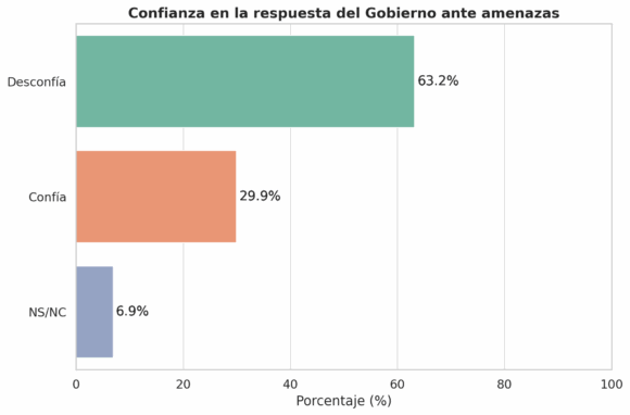 El nivel de confianza en la respuesta del Ejecutivo ante este tipo de amenazas también es bajo: el 63,2% se muestra escéptico, frente a un 29,9% que transmite tranquilidad y un 6,9% que no contesta. Por edades, el grupo más desconfiado es el de mayores de 55 años (66,5%). Entre los votantes de Sumar, un 32,2% también expresa dudas sobre la gestión del Gobierno.