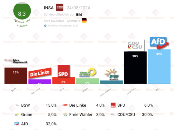 A medida que se acercan las elecciones estatales en Sajonia y Turingia, programadas para el próximo domingo, las encuestas más recientes realizadas por el Instituto INSA reflejan un panorama político donde la Alternativa para Alemania (AfD) se posiciona como el partido dominante en ambos estados alemanes.