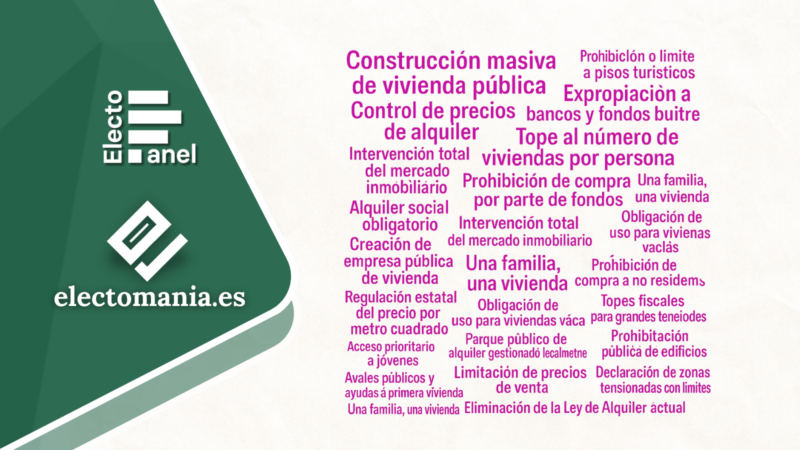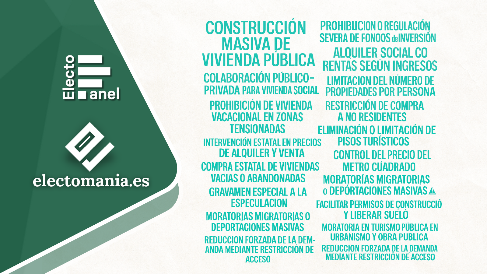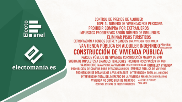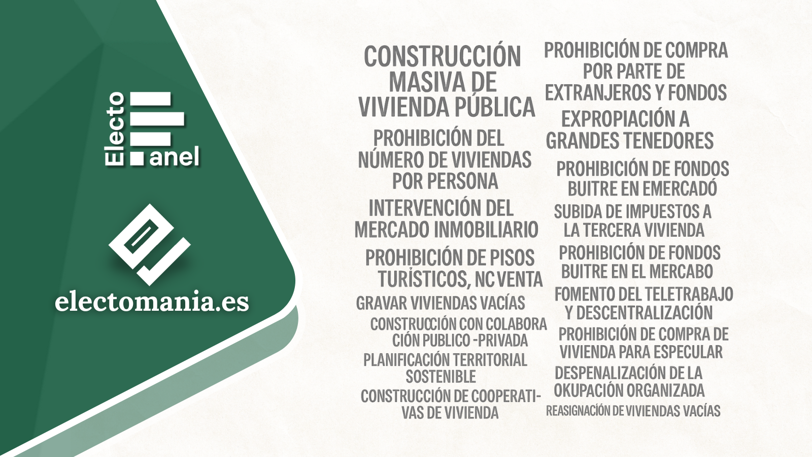 Este grupo sitúa entre sus primeras prioridades la construcción de vivienda pública gestionada por el Estado, la expropiación de fondos y grandes tenedores, y la intervención integral del mercado inmobiliario. Subrayan el carácter de la vivienda como derecho no mercantilizable, favorecen impuestos progresivos a partir de segundas viviendas, limitan el número de viviendas por persona y exigen la restricción severa de pisos turísticos. Resalta también la creación de empresas públicas, el alquiler social a precio asequible y la supresión de empresas de desahucio.