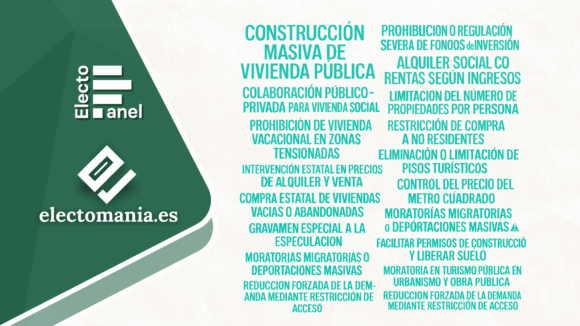 El ElectoPanel especial sobre vivienda permite entender el tipo de medidas que preferiría aplicar cada universo de votantes para abordar el acceso a la vivienda. La consulta pide respuestas en abierto, lo que da pie a propuestas heterogéneas y a menudo muy definidas ideológicamente, como muestra el siguiente repaso diferenciado por grupos de votantes.
