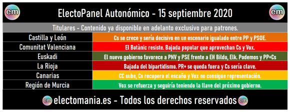 Beneficios exclusivos: Acceso completo: adelanto de los paneles horas antes de su publicación en abierto, panel para generales: (desglose de escaños y voto por provincias y partidos, mapa del partido ganador por provincias), electoPanel autonómico quincenal exclusivo, sección exclusiva para Patrones en El Foro y electoPanel especial VIP mensual exclusivo.