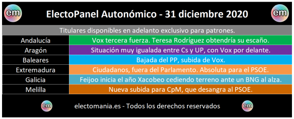 Beneficios exclusivos: Acceso completo: adelanto de los paneles horas antes de su publicación en abierto, panel para generales: (desglose de escaños y voto por provincias y partidos, mapa del partido ganador por provincias), electoPanel autonómico quincenal exclusivo, sección exclusiva para Patrones en El Foro y electoPanel especial VIP mensual exclusivo.