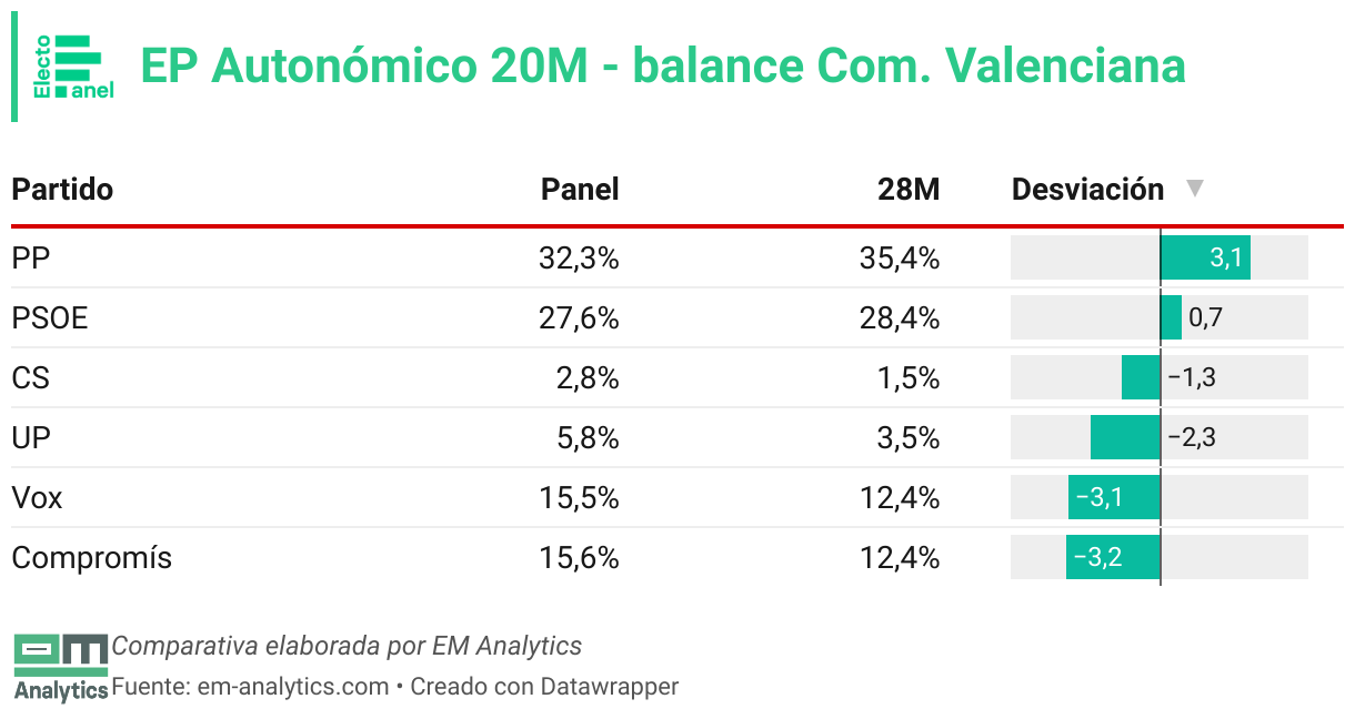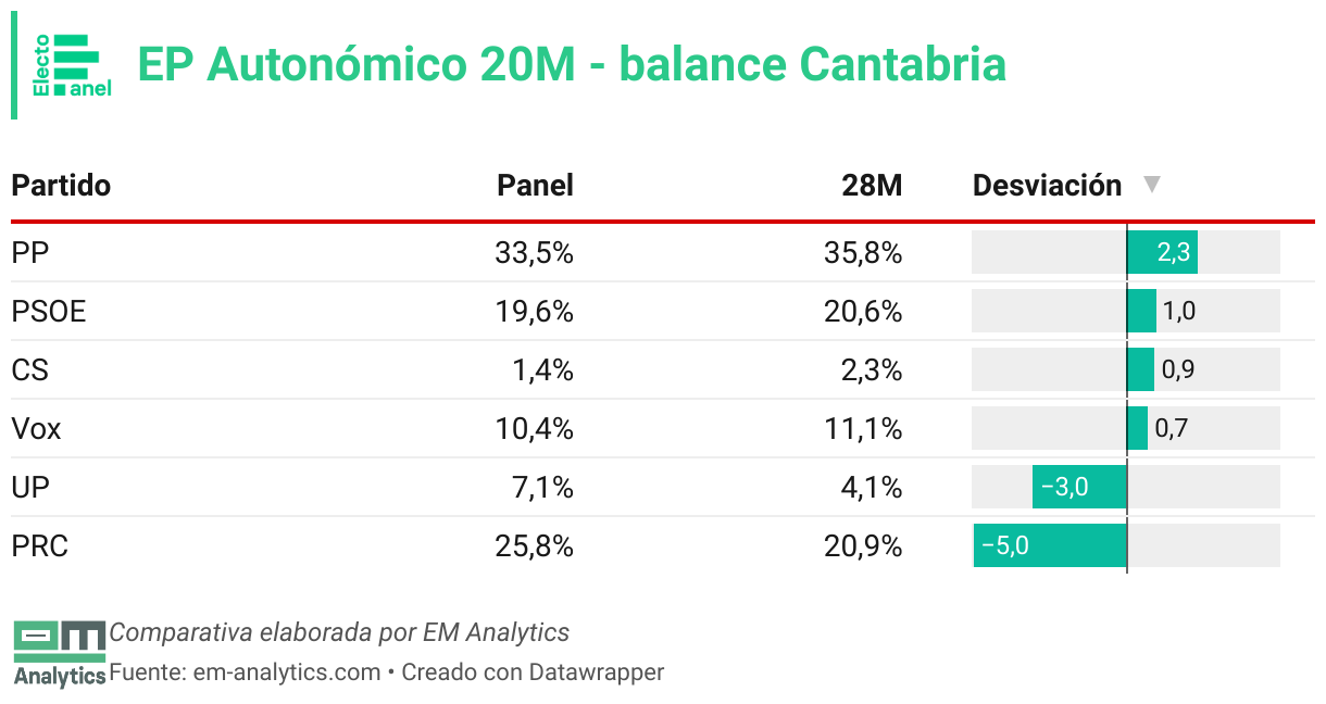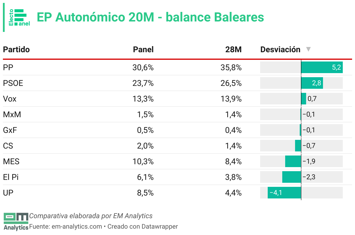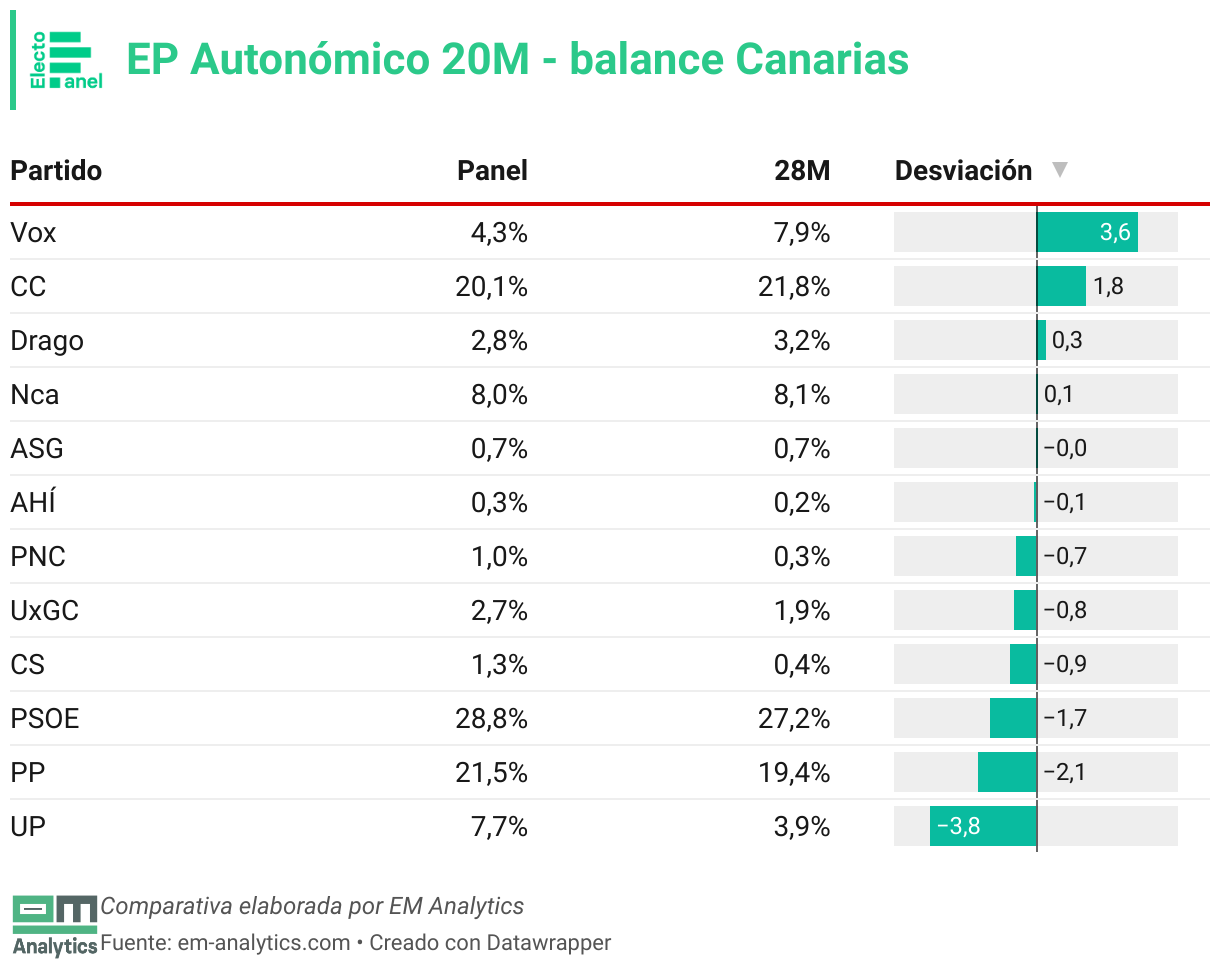 En el conjunto de los paneles, de los 104 partidos estimados (nuestro panel ha tenido en cuenta más formaciones políticas que cualquier otro sondeo, especialmente en lugares como Canarias) en 81 de ellos se ha estimado una intención de voto que se ha desviado menos de 3 puntos.
