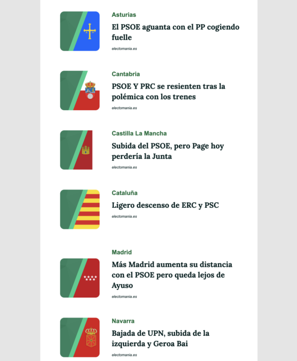 ElectoPanel autonómico exclusivo para patrones, con estimación de voto y diputados para: Asturias, Cantabria, Cataluña, Com. Madrid, Navarra y Castilla-La Mancha.