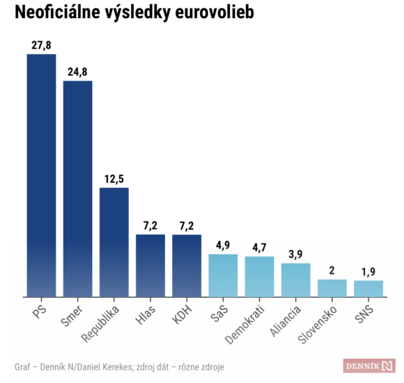De acuerdo con el diario, Progresívne Slovensko habría obtenido 6 escaños en el Parlamento Europeo, Smer-SSD 5, Republika 2, y tanto KDH como Hlas un escaño cada uno. Esto dejaría fuera del europarlamento a partidos como SaS, Demokrati, SNS y la Alianza Húngara.