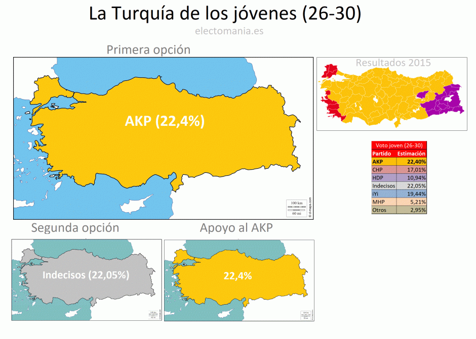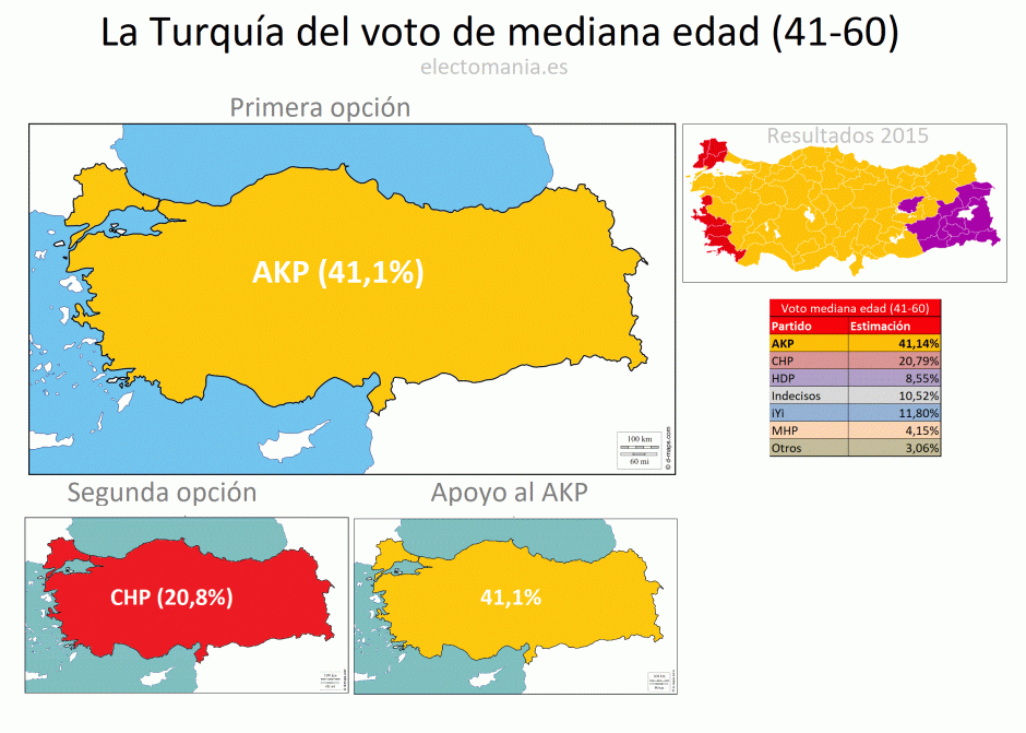 Como se puede observar, el apoyo al AKP de Erdogan aumenta a medida que aumenta la edad de los votantes, y en todas las franjas de edad excepto los jóvenes de 18 a 25 años consigue ser primera fuerza con el CHP como alternativa opositora.