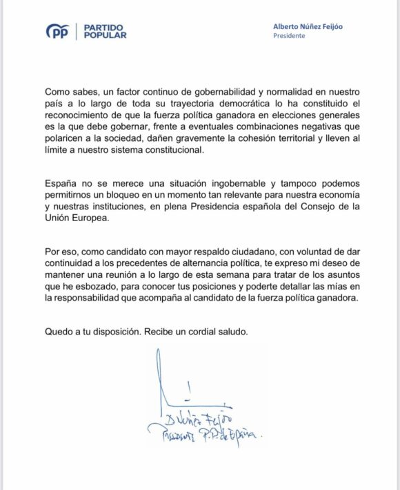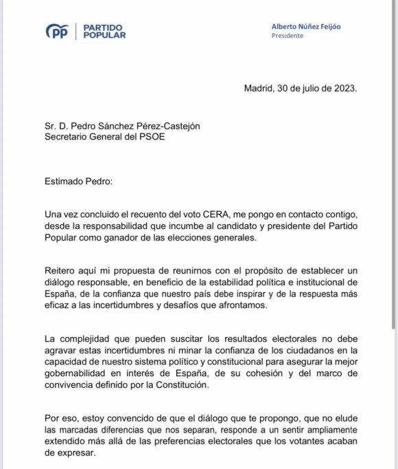 En la misiva insiste en que España debe tener una solución a la situación de dudosa gobernabilidad tras el 23J y pedirá a los socialistas que faciliten su investidura para conformar un gobierno.