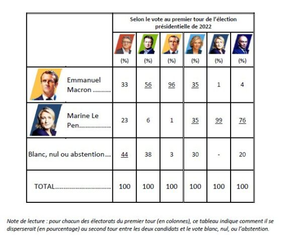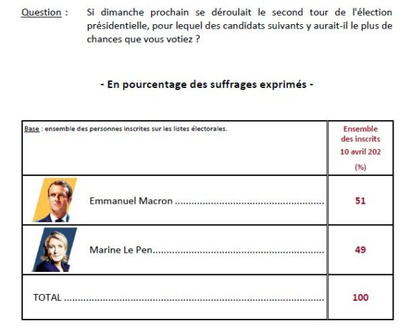 Por ahora hay dos sondeos, por un lado Ipsos, que apunta a una victoria de Macron por 8 puntos, y por otro Ifop, que pronostica un empate técnico con 2p de ventaja para el Presidente: