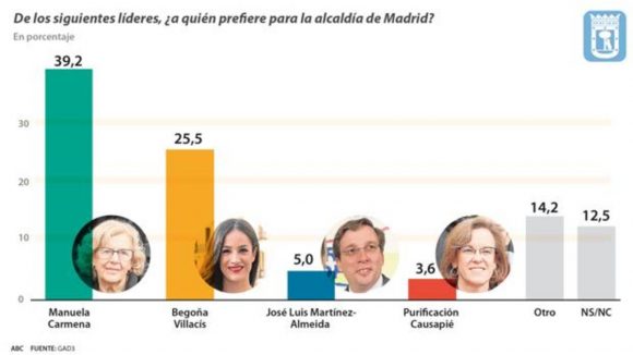 Según un sondeo de GAD3 para el diario ABC, los madrileños prefieren a Manuela Carmena como alcaldesa seguida por Villacís: