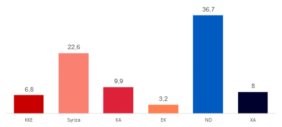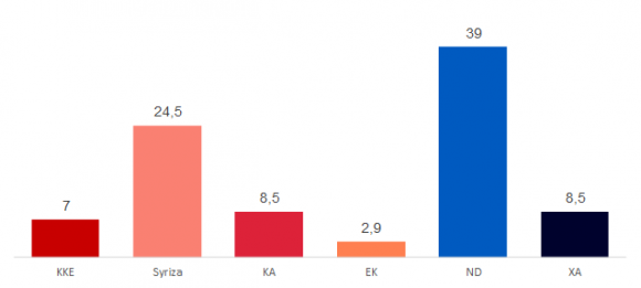 Unión de Centristas (EK) se quedaría justo en el umbral del 3% que le permitiría acceder al parlamento. ANEL, socio de Syriza, con un 2% queda lejos de esa barrera. Nueva Democracia obtendría 162 escaños, 6 más que la mayoría absoluta. Syriza obtendría 70 diputados.