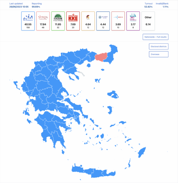 El partido conservador Nueva Democracia (ND, 40,5% y 157 escaños) del primer ministro Kyriakos Mitsotakis ha logrado una clara victoria y la mayoría absoluta que le permitiría gobernar en solitario, según una proyección elaborada sobre resultados oficiales aún parciales publicada por el Ministerio del Interior.