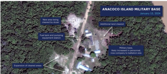 El Centro de Estudios Estratégicos e Internacionales (CSIS), con sede en Estados Unidos, publicó varias imágenes de satélite que revelaban que Venezuela estaba ampliando su base militar en la isla de Ankoko y en la zona de Punta Barima, cerca de Guyana.