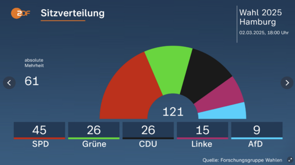 Con la distribución de escaños proyectada por ZDF, el SPD obtendría 45 escaños, y los Verdes 26, lo que sumaría 71, asegurando la mayoría absoluta (fijada en 61 escaños) sin necesidad de recurrir a otros partidos.