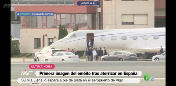Las televisiones han podido retransmitir el momento de su bajada del avión, por la escalerilla. Juan Carlos I ha saludado a la prensa al abandonar el aeródromo, e incluso ha hecho el ademán de hacer declaraciones, bajando la ventanilla del coche que le trasladaba al domicilio del amigo que le acogerá en Sanxenxo.
