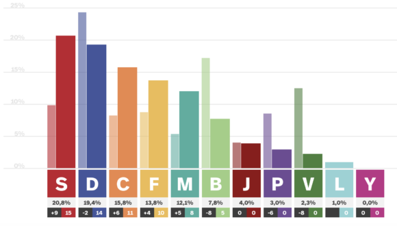 - Coalición de centro-izquierda: S (20,8%), D (19,4%) y F (13,8%) podrían sumar fuerzas, alcanzando el 54% del total de votos y asegurando una mayoría sólida.