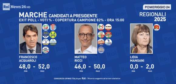El consorcio Opinio Italia para Rai sitúa al candidato del centro-derecha, Acquaroli, en una horquilla de entre 48,0% y 52,0% de los votos.