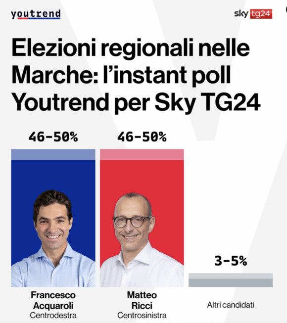 Las elecciones regionales en Marche han dejado un escenario de gran incertidumbre. Los primeros exit polls difundidos por Rai y La7 apuntan a una contienda muy reñida entre el actual presidente regional, Francesco Acquaroli (centro-derecha), y el candidato del centro-izquierda, Matteo Ricci.