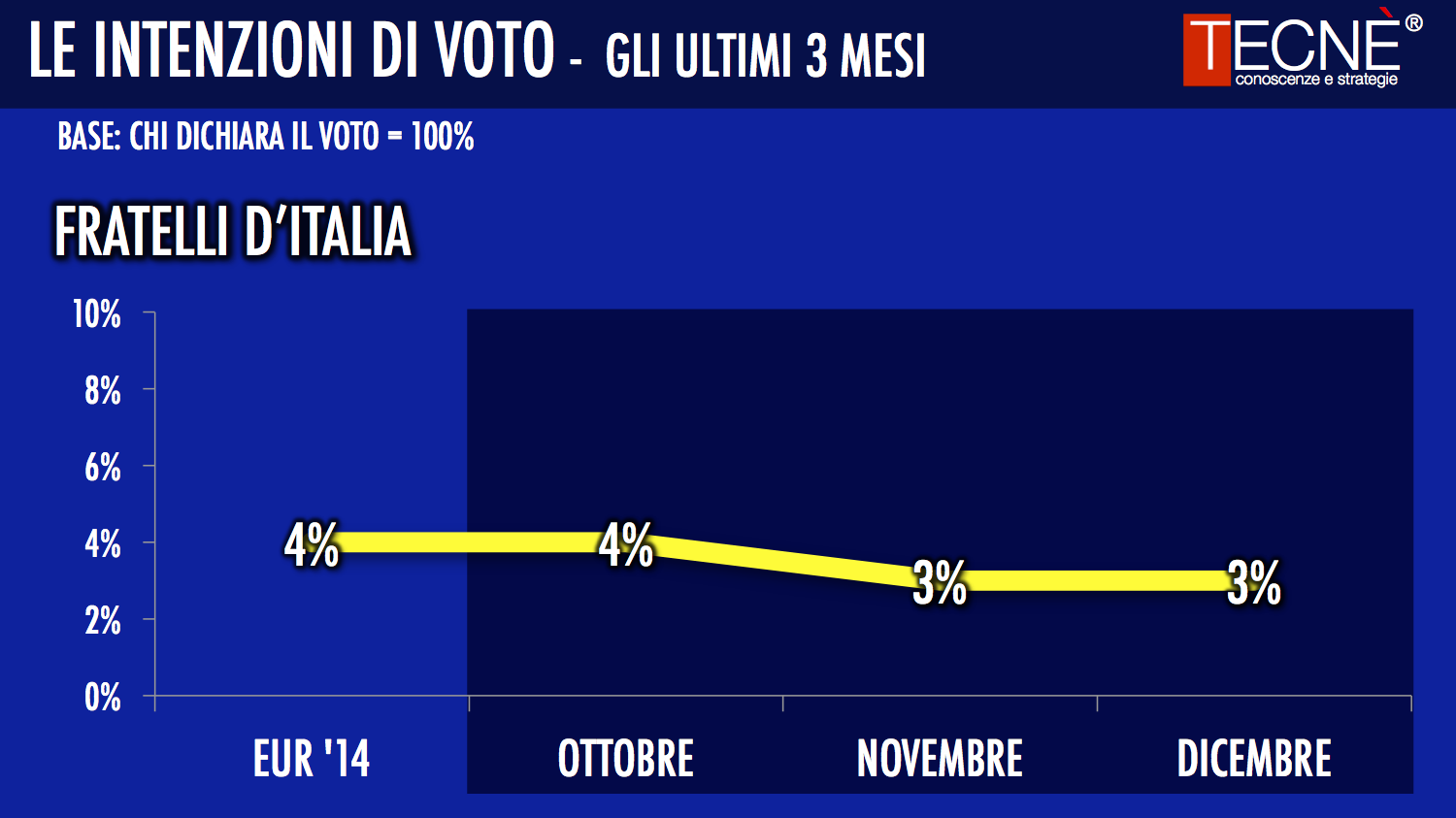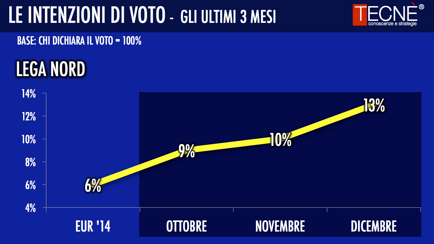 La encuestadora Tecné refleja, al igual que casi todas las demás, el leve pero paulatino descenso del Partido Democrático de Matteo Renzi desde las pasadas Elecciones Europeas. Siendo el único partido que sube la Liga Norte de Matteo Salvini.