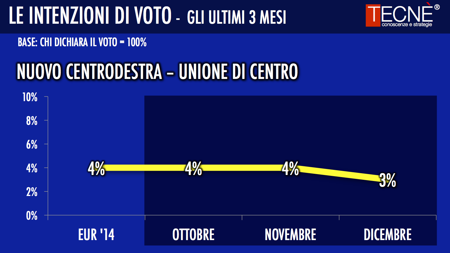 La encuestadora Tecné refleja, al igual que casi todas las demás, el leve pero paulatino descenso del Partido Democrático de Matteo Renzi desde las pasadas Elecciones Europeas. Siendo el único partido que sube la Liga Norte de Matteo Salvini.