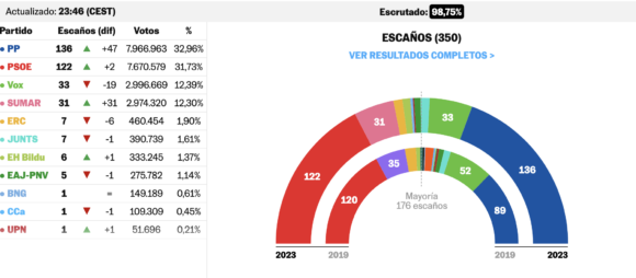 Con los datos del recuento al 95% escrutado, en estos momentos la suma de PP y Vox no sumaría mayoría absoluta (169), pero tampoco el bloque de la izquierda.