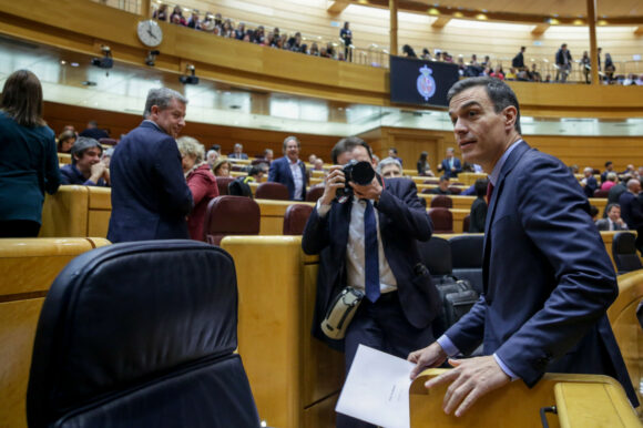 Los senadores de Junts han mostrado este martes en el Pleno del Senado, coincidiendo con la comparecencia del jefe del Ejecutivo, Pedro Sánchez, un cartel en el que se puede leer en catalán “Catalán Gate. Nos están vigilando”.