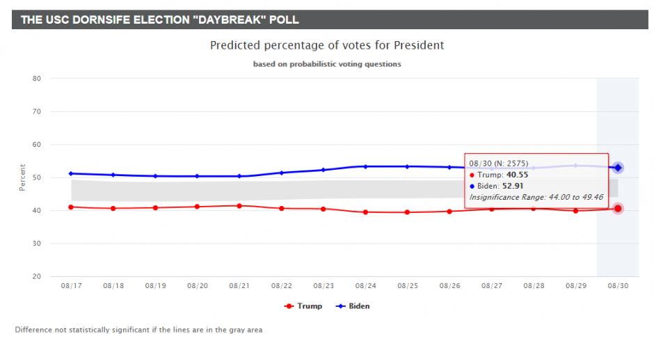 Emerson, en conjunto, concede 2 puntos de ventaja a Biden sobre Trump, YouGov seis, y USC llega a los 12,5. Solo son tres ejemplos, dentro de una variedad aún mayor, que lleva la ventaja en porcentaje en las últimas dos semanas desde un punto ¡a favor de Trump! a catorce ¡a favor de Biden!