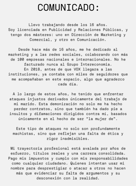 Lidia Bedman, mujer de Abascal, desmiente la información publicada por El Confidencial en un comunidado