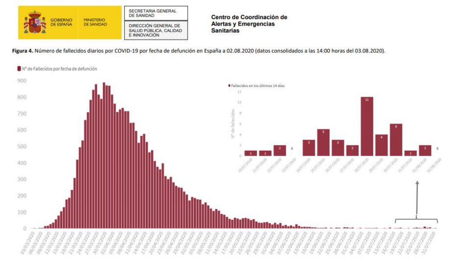 Por último, para una visión más de conjunto, es necesario volver a poner el foco (como hicimos durante semanas en marzo y abril) en el número de fallecidos. Este dato hoy por hoy no tiene afortunadamente nada que ver con los de la primera oleada de la pandemia. En la actual segunda oleada, por ser de menor entidad, por afectar a personas en promedio más jóvenes, y por otros factores aún por determinar, parece que la letalidad es muy inferior.