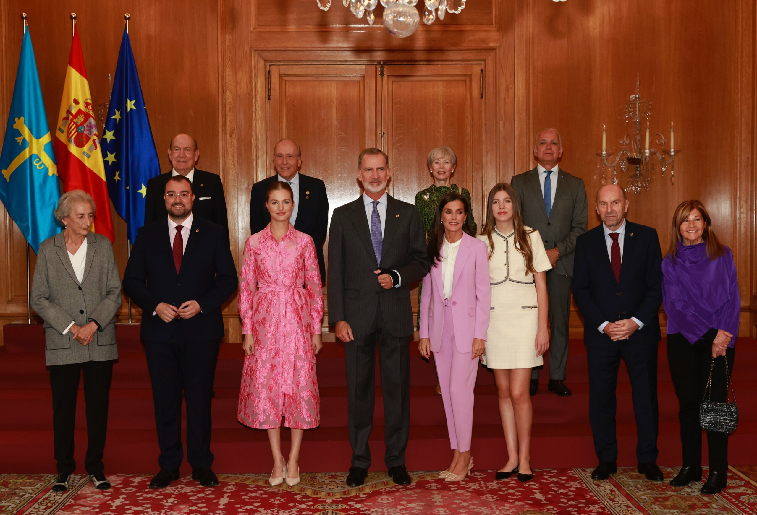 Tras recibir a los galardonados con los “Premios Fin de Carrera 2022” de la Universidad de Oviedo, la Familia Real se ha reunido con las “Medallas de Asturias 2023” -que este año han recaído, entre otros, en el chef José Andrés y en el prestigioso oftalmólogo Luis Fernández Vega- los “Hijos Predilectos” y el “Hijo Adoptivo 2023” -el periodista Juan Ramón Lucas- con los que los Reyes y sus hijas han conversado durante unos minutos.