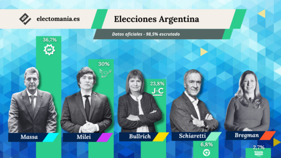 El candidato de Unión por la Patria alcanza un sorprendente resultado, con un 36,7 % de apoyos, superando el 30,31 % cosechado por Milei.